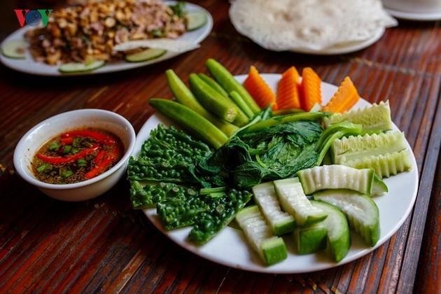 Man kann den Uot-Kuchen mit Salaten, gegrilltem Fleisch und Fischsoße genießen.